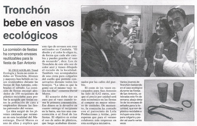 Calor, calor, calor De mi visita a nuestro querido TRONCHON, los comentarios más destacados son los siguientes: La reciente celebración de la fiesta de SAN ANTONIO DE PADUA, la cual fué muy bién, segun comentarios. Los mayorales invitaron a paella, pastas y refrecos a todo el pueblo. Otra noticia es el calor sofocante, que como en toda España está sufriendo nuestro pueblo. La falta de agua, ya se está haciendo notar, y después de ocho o diez dias de temperatuas de Agosto , los sembrados ya están secos, cosa anormal, puesto que nos hemos adelantado un mes y las cosechas se presentas malas, aunque a eso ya están acostumbrados. "27 de Junio 2002,................Antonio Conesa " |